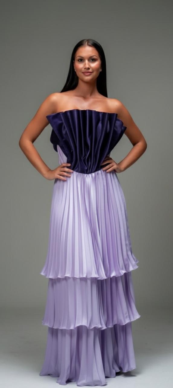 This sleeveless gown in a rich coral shade features a chic keyhole neckline and a flattering fitted bodice. The tiered, gathered skirt adds volume and flow, creating a graceful and feminine silhouette. A perfect blend of elegance and comfort for both formal and semi-formal occasions.